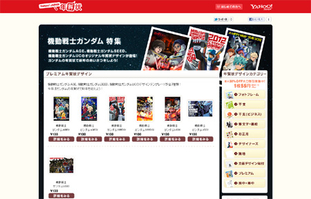 現在「機動戦士ガンダム特集」を実施中の、日本最大級のポータルサイト「Yahoo!JAPAN」内のコンテンツ、「Yahoo!JAPAN年賀状」に、ガンダムシリーズのオリジナル年賀状デザインが登場した。価格は各130円(税込)。