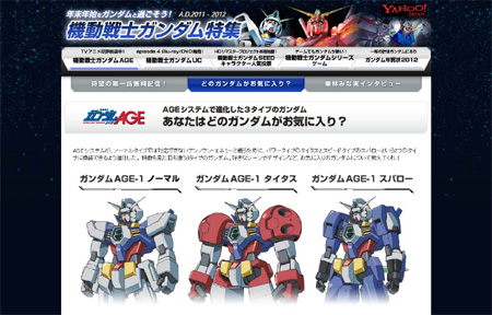 さらに現在、Yahoo!JAPAN「機動戦士ガンダム特集」特設ページにて、『機動戦士ガンダムAGE』に登場する主役機「ガンダムAGE-1」の3形態「ノーマル」、「タイタス」、「スパロー」のお気に入りのシーンやデザインをTwitterでつぶやく「機動戦士ガンダムAGEつぶやき合戦」も実施されている。
