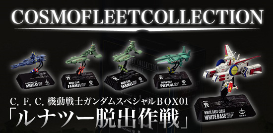 極小ながらも精密なディテールを再現する「コスモフリートコレクション」シリーズでは、初となる限定スペシャルBOXとして、『機動戦士ガンダム』より「ルナツー脱出作戦」と「ア・バオア・クー攻防戦」の2アイテムの予約受付が、プレミアムバンダイ・メガトレショップにて開始された。