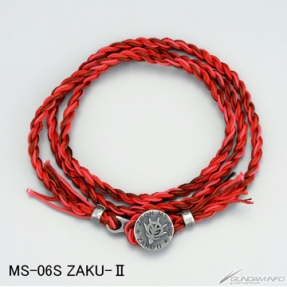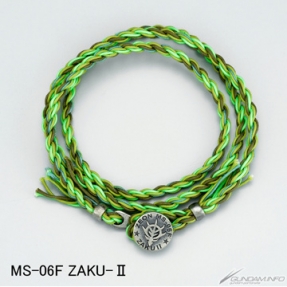 カラーは「シャア専用ザク」をイメージとした“レッド”、「ザク」をイメージした“カーキ”、「グフ」をイメージした“ブルー”、「ドム」をイメージした“パープル”の4色で、「JAM HOME MADE」の定番アイテムである編み込みブレスレットをアレンジし、ロープの留め具部分には「ジオン公国軍」のエンブレムが配されている。