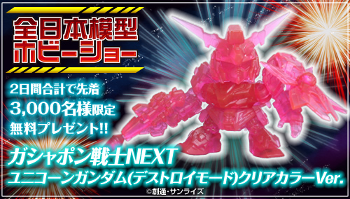 10月11日(金)から13日(日)に千葉・幕張メッセで開催される「全日本模型ホビーショー」のバンダイブースでは、一般公開日となる10月12日(土)、13日(日)の2日間、同ブースにて実施される簡単なアンケートに回答すると、各日1,500名、合計3,000名に「ガシャポン戦士NEXT ユニコーンガンダム(デストロイモード)クリアカラーVer.」が先着でプレゼントされる。