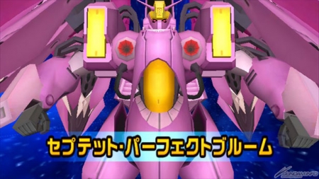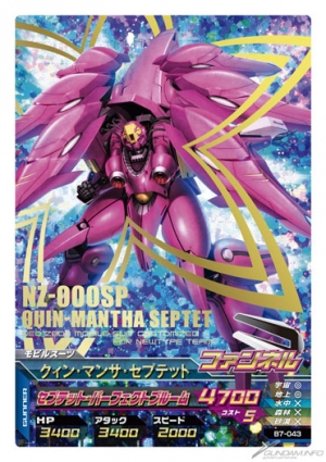 これまで、開発ミッション「戦場のローレライ」のミッションをクリアすると開発可能なビルドMS登場していた、トライエイジオリジナル機体「クィン・マンサ・セプテット」がパーフェクトレアとして収録される。