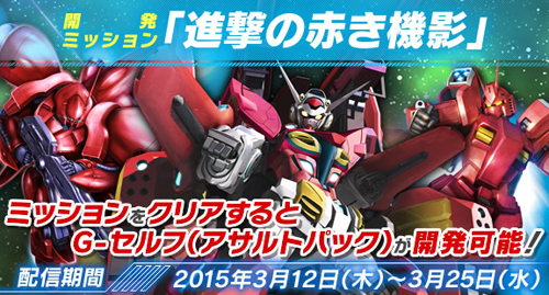 ミッションでは、「G-セルフ(アサルトパック)」、「ガンダムアメイジングレッドウォーリア」、「ガーベラ・テトラ」といったエース機体がそろって襲来。見事ミッションをクリアすると、「G-セルフ(アサルトパック)」をビルドモビルスーツとして開発することができるようになる。