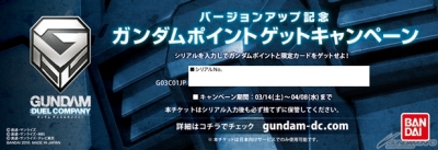 ネットカードダス「ガンダムデュエルカンパニー」では、5月に大型アップデートが行われることが決定し、それを記念する「GPゲットキャンペーン」と「第2回世界大会」が開催される。