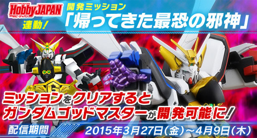 本ミッションは、トライエイジオリジナルMS「ガンダムゴッドマスター」が、本日3月25日(水)発売の「月刊ホビージャパン 2015年5月号」にて立体化されることを記念して配信されるもの。