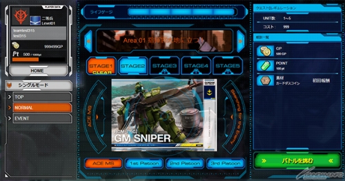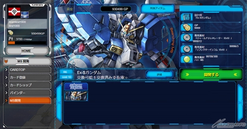 1つめの注目ポイント「MS開発モード」は、商品パック内のインデックスに記載されているシリアルコードを公式サイトで入力することで手に入るゲーム内通貨「ガンダムポイント」と、シングルモードで敵部隊を撃破することなどにより獲得できる「開発用素材」を使うことで、新たなモビルスーツを開発できるというもの。しかも開発したモビルスーツは実物のカードとなって自宅へ届けられる。
