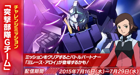 本ミッションでは、「フリット・アスノ」の搭乗機である「ガンダムAGE-1 グランサ」が出現。見事ミッションをクリアすると、バトルパートナー「ミレース・アロイ」が登場する可能性がある。配信期間は7月29日(水)まで。