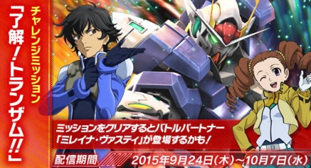 本ミッションでは、「刹那・F・セイエイ」の搭乗機である「ダブルオーガンダム」が出現。見事ミッションをクリアすると、バトルパートナーとして「ミレイナ・ヴァスティ」が登場する可能性がある。配信期間は10月7日(水)まで。