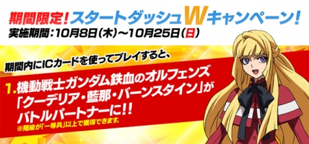 本日10月8日(木)より開催される「スタートダッシュWキャンペーン」では、期間内にICカードを使用してプレイすると『機動戦士ガンダム 鉄血のオルフェンズ』よりバトルパートナー「クーデリア・藍那・バーンスタイン」を獲得することができる。