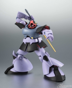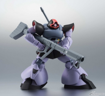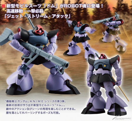 「ROBOT魂 ドム ver. A.N.I.M.E.」は、腹部だけでなく胸部にも可動軸が設けられているほか、肘や膝の圧倒的な可動によって劇中のアクションやシーンを再現可能。また、「ヒート・サーベル」などの武装と「ダメージガンダムシールド」が付属する。