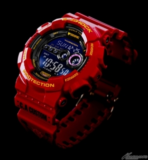 「シャア専用 G-SHOCK」は、ベースカラーに赤の光沢ボディと黒の反転液晶が採用され、ピンクのアクセントがシャア専用MSのモノアイを表現しているほか、尾錠は特別色のゴールドカラーとなっている。