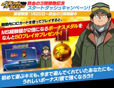本日1月28日(木)より開催される「スタートダッシュキャンペーン」では、期間内にICカードを使用してプレイすると、MS経験値が2倍になる「ボーナスメダル」が50プレイ分プレゼントされる。開催期間は、「鉄血の3弾」稼働中。