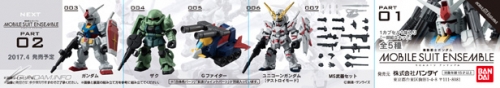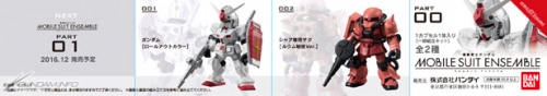 「モビルスーツアンサンブル(MOBILE SUIT ENSEMBLE)」は、“武装”をテーマにしたガンダムの新ホビーシリーズで、機体の各所に配された3mmの共通の穴(ハードポイント)に、あらゆるパーツを接続できる機構により、自分だけのモビルスーツを作成することが可能となっている。第00弾は12月中旬、第01弾は12月下旬にそれぞれ発売予定、価格は各500円(税込)。