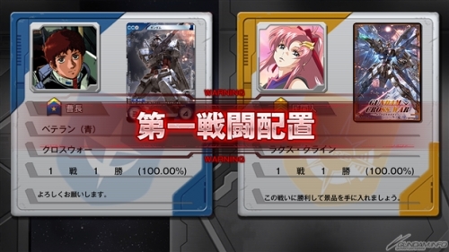 イベントは、GCWの開発スタッフが「演習」に登場し、マッチングされると対戦することができるというもの。対戦方法はアプリ内「メインブリッジ」画面で「対戦モード」を選び、「演習」をタップ。運良く上記の画面が表示されたら、GCW開発スタッフと対戦に突入。GCW開発スタッフは「ラクス・クライン」隊員アイコンの「SEED DESTINYデッキ」をプレイする。