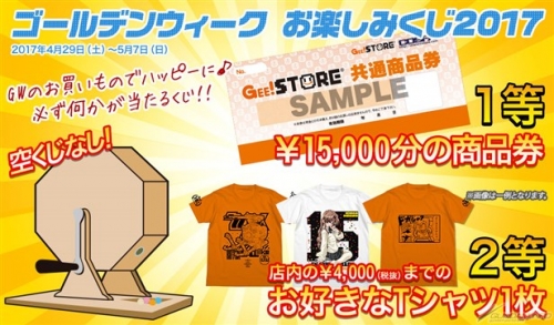 ジーストア各店、コスパオフィシャルショップではゴールデンウィーク中必ず何かが当たる、お楽しみおみくじを実施中。1会計につき3,000円(税抜)以上の購入で1回くじ引きが出来る。今年はジーストア15周年にちなんで、1等は15,000円の商品券が登場。開催期間は5月7日(日)まで。
