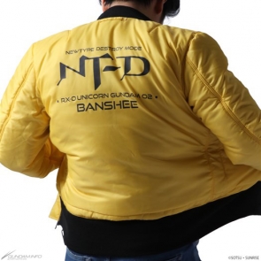 「バンシィモデル」は、ブラックボディと、サイコフレームの発光をイメージしたイエローを配したデザイン。こちらもリバーシブル仕様となっており、ブラック側にはガンダムシリーズにてモビルスーツなどを生産しているアナハイム・エレクトロニクス社のエンブレムを右胸に配置。イエロー側の背面には黒い文字で「NT-D」ロゴがプリントされている。