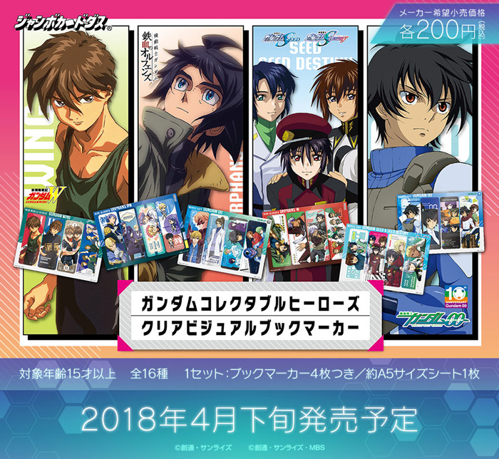 『新機動戦記ガンダムW』、『機動戦士ガンダムSEED』、『機動戦士ガンダムSEED DESTINY』、『機動戦士ガンダム00』、『機動戦士ガンダム 鉄血のオルフェンズ』より全16種類で登場し、1シートで4枚のブックマーカーが手に入る。