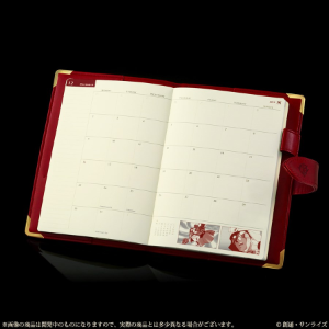 実用的で携帯性に優れたB6サイズとなっており、月間と週間の合計192ページ。表紙カバーは、使いやすい落ち着きのある深い赤色のポリウレタン製素材で、表面にはシャアの所属部隊番号の“A12”、裏面には“Char Aznable”のサインが型押しされている。カバーの角は、金色の金具で補強され、耐久性と高級感を兼ね備えている。