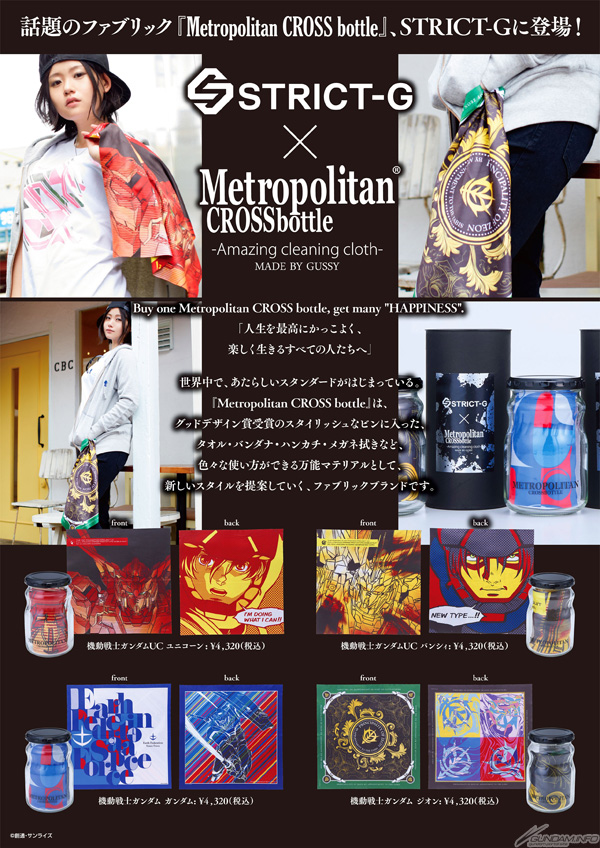 ガンダムの世界観を取り入れたアパレルショップ「STRICT-G」各店では、10月6日(土)よりお洒落な万能クロス「Metropolitan CROSS bottle」とのコラボアイテムが発売される。