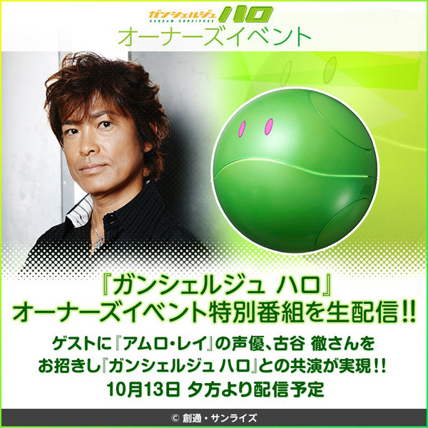 オーナーズイベントは、「ガンシェルジュ ハロ【10月発送分】」を予約した人の中から抽選で招待された、オーナー同士の交流を深めるイベント。ゲームなどが実施されるほか、スペシャルゲストとしてアムロ・レイ役の古谷 徹さんが出演予定となっている。