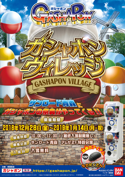 ガシャポンの人気アイテムが一挙大集合するイベント「ガシャポンヴィレッジ」は、本日12月28日(金)から2019年1月14日(月・祝)まで、サンロード青森にて開催される。入場無料。