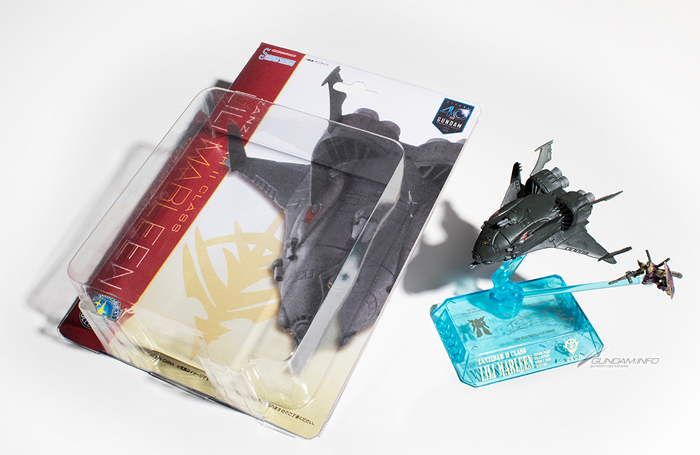 フル彩色完成品の本アイテムは、軍用艦らしい彩色とディテールにこだわり、全長約90ミリながらリアルさを追求。好評のミニモビルスーツは、劇中でシーマが搭乗した「ゲルググM(指揮官用)」が付属。さらに、専用台座は、宇宙空間をイメージしたクリアダークブルーにゴールドのタンポをまとった特別仕様となっている。