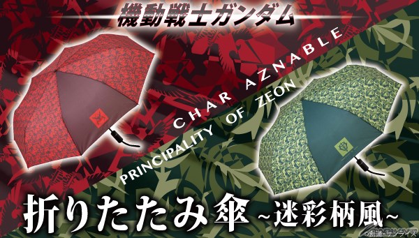 「機動戦士ガンダム 折りたたみ傘」は、シャアモデルとジオンモデルがラインナップし、それぞれのマークを迷彩柄風にアレンジしたデザインで登場。