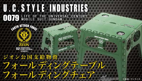 ジオン公国地球方面軍の備品をイメージしたアウトドアシリーズ「U.C.STYLE INDUSTRIES」より、インドアでも活躍する「フォールディングテーブル」と「チェア」が登場。