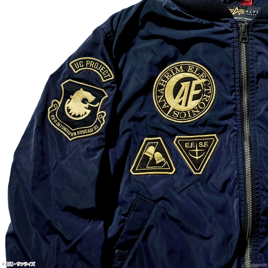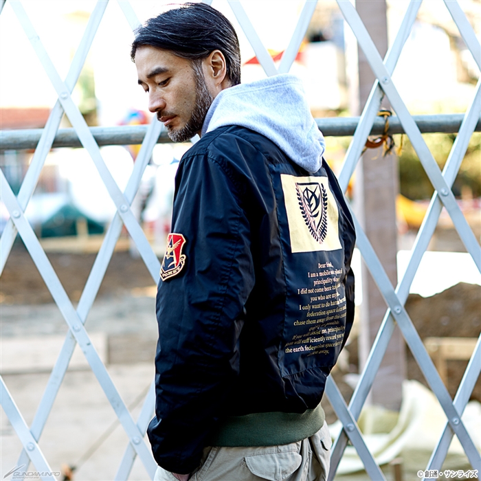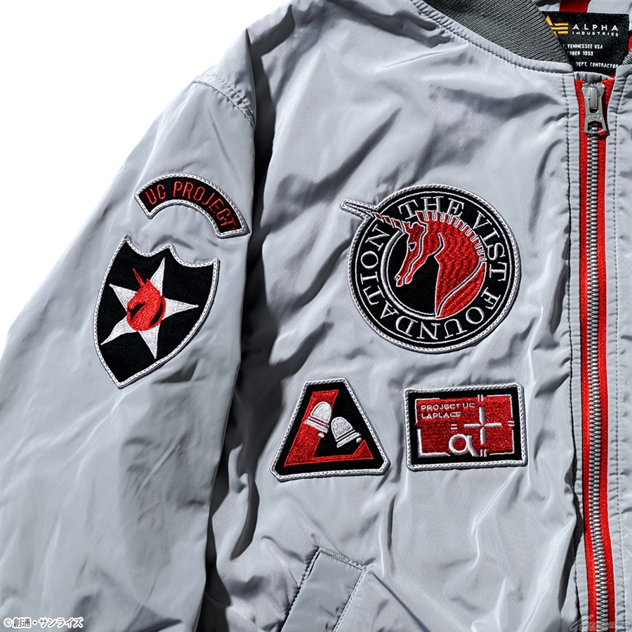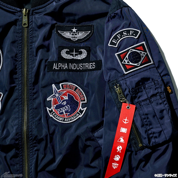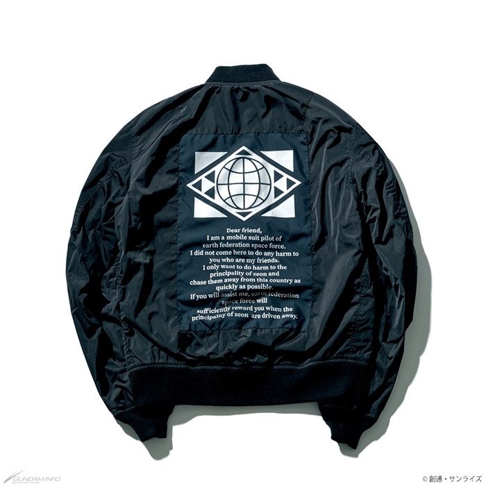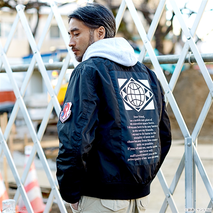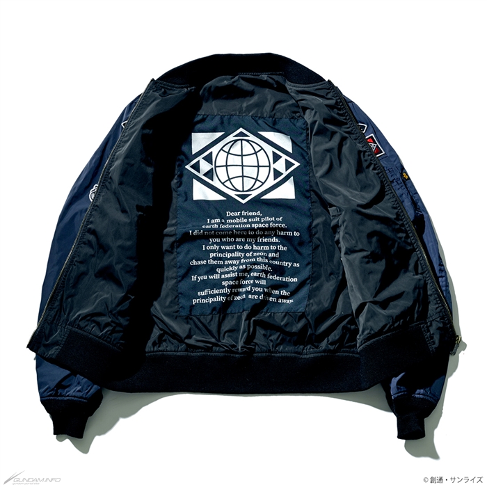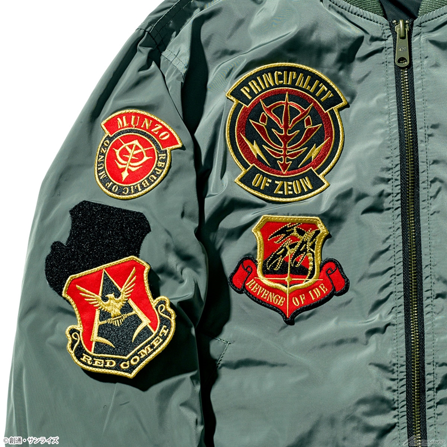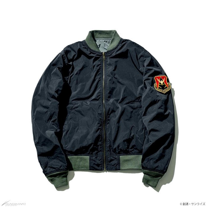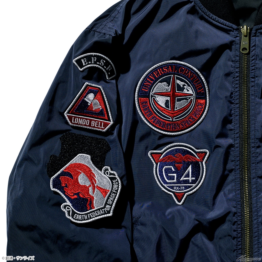 フロント左右・両袖に地球連邦軍の部隊関連エンブレムパッチが付属し、右袖のペガサスマークのワッペンは面ファスナーで取り外しが可能。リバーシブルにて着用した際には、左袖の面ファスナーに取り付ける事ができ、着こなしのバリエーションも楽しめる。