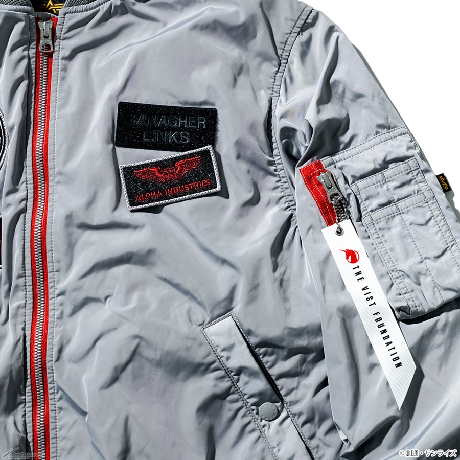 バナージのパイロットスーツをイメージしたカラーリングで、フロント部分・右袖にはエンブレムパッチをデザイン。左胸のALPHA社マークのワッペンは、面ファスナー仕様で取り外せるほか、外したその下には“BANAGHER LINKS”の文字が現れるギミックが施されている。