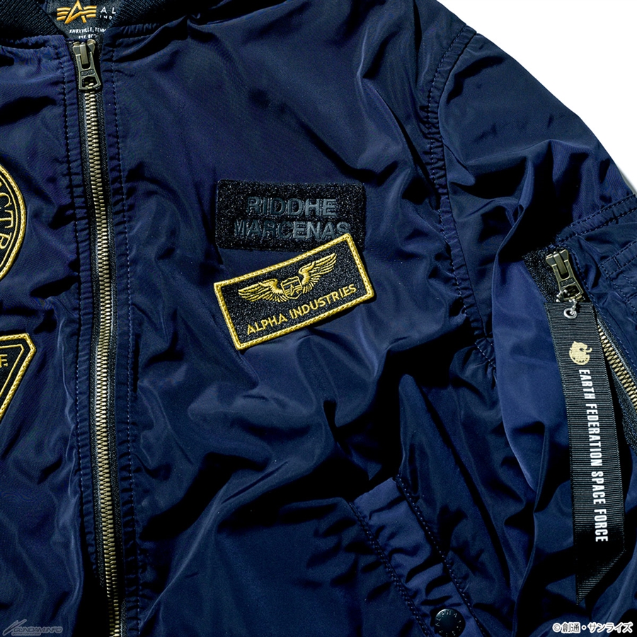 リディのパイロットスーツをイメージしたカラーリングで、フロント部分・右袖にはエンブレムパッチをデザイン。左胸のALPHA社マークのワッペンは、面ファスナー仕様で取り外せるほか、外したその下には“RIDDHE MARCENAS”の文字が現れるギミックが施されている。