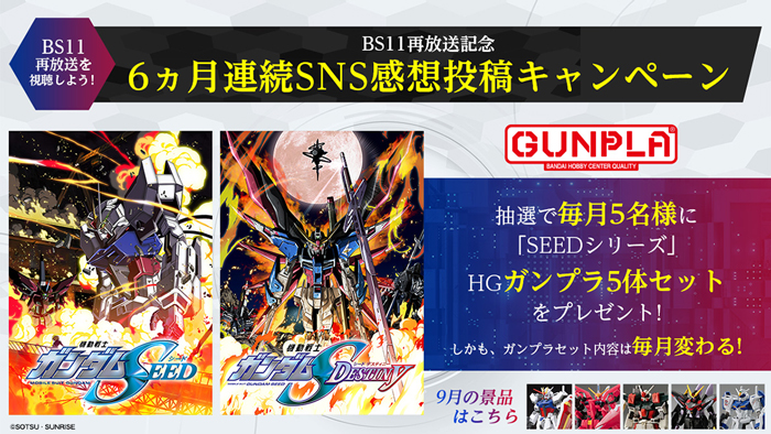 BSデジタル放送「BS11」で『機動戦士ガンダムSEED HDリマスター』および『機動戦士ガンダムSEED DESTINY HDリマスター』が再放送されることを記念した「6ヵ月連続SNS感想投稿キャンペーン」が、明日9月2日(土)よりスタートする。