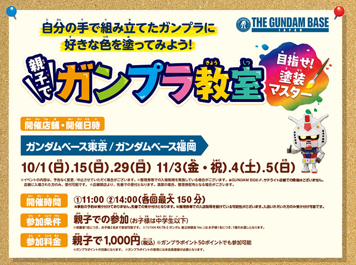 また、「ガンプラコンペティション」や「ガンプラ組立体験会&ミキシング体験会」、「親子でガンプラ教室“目指せ!塗装マスター”」、「GUNPLA SCAN MOVIE」といったさまざまな催しも順次実施されるので、ぜひ足を運んでみよう。
