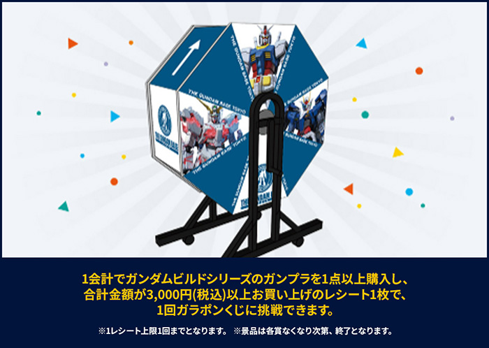 1会計でガンダムビルドシリーズのガンプラを1点以上購入し、合計金額が税込み3,000円以上購入したのレシート1枚につき1回、ガンプラくじに挑戦できる。