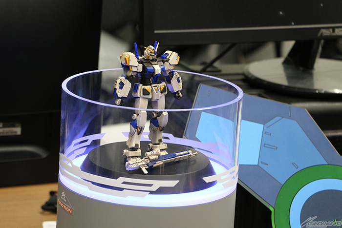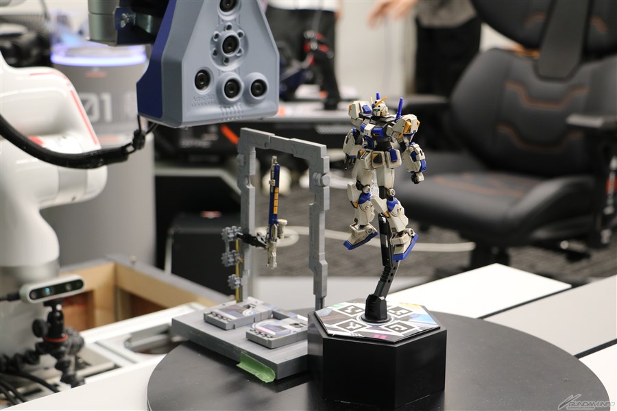 まずはじめに、ベースにガンプラ本体をセッティングし、スキャンを行う。その際、足裏のディテールなど細部まで綺麗にスキャンするため、望ましいポージングをさせる必要がある。また、今回は“武器を含めたスキャンが可能”ということで、本体と同時に武器もスキャン。ビームライフルのビームやビームサーベルの色は、スキャン後、選択肢から自由に選ぶことができる。