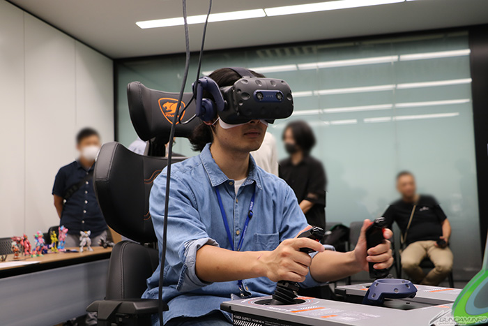 スキャンが完了すると、いよいよVRの世界へ。まるでコックピットのようなシートが用意され、座るだけでモビルスーツのパイロットになったかのような気分が味わえる。
