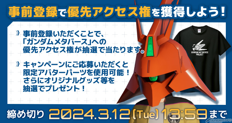 さらに、事前登録とキャンペーンがスタート。応募者全員に「ガンダムメタバース」内の限定アバターパーツ「サザビーヘッド」がプレゼントされるほか、抽選で「優先アクセス権」やオリジナルグッズ、ガンプラを含むガンダム関連商品もプレゼントされるので、ぜひ登録しておこう。
