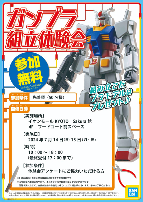「ガンプラ組立体験会」が、7月14日(日)・15日(月・祝)に「THE GUNDAM BASE SATELLITE(ガンダムベースサテライト)」京都店にて開催される。