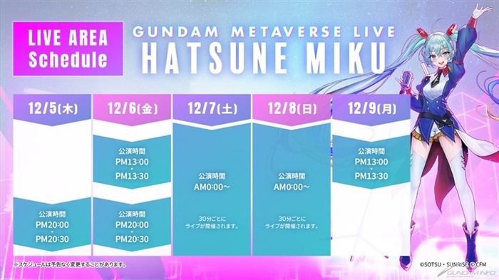 今回は初音ミクとのスペシャルコラボレーション施策の第1弾として、ガンダムメタバースライブが実現。ガンダムメタバースにログインすれば誰でもライブを楽しむことができる。