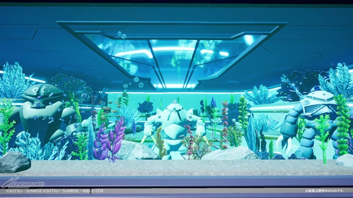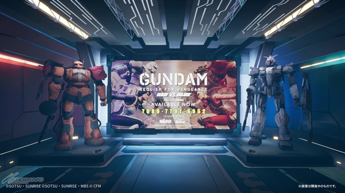 PVなどの動画が視聴できるシアター。『機動戦士ガンダム 復讐のレクイエム』に登場するザクII F型(ソラリ機)とガンダムEXの立像も。