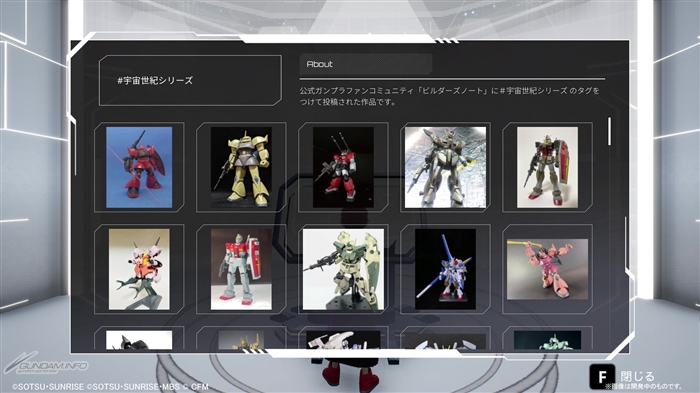 ガンプラ公式コミュニティ「ビルダーズノート」で活動しているガンプラサークルの作品や、「ビルダーズノート」内で投稿された作品の写真がミュージアム形式で展示されている。作品に対するリアクションを行うことも可能。作品数は実に1,000件(!)を越えており、ガンプラ写真を多数展示しているフォトギャラリーでは展示テーマが日ごとに更新され、作品が切り替わるようになっている。