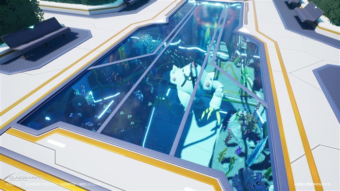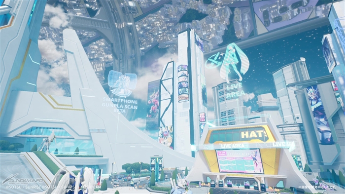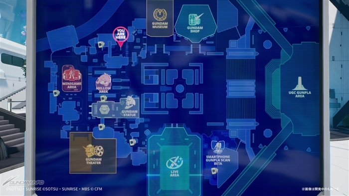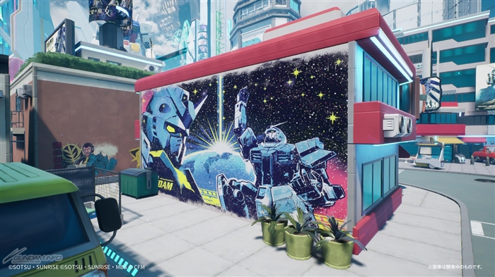 メインロビーにはどこか見覚えのある車両やオブジェ、ガンダムファンにはおなじみの企業の広告、「ガンダムシリーズ」の様々な作品をモチーフにしたストリートアートなどが溢れている。中には現実世界に存在する名所が再現されているケースも。