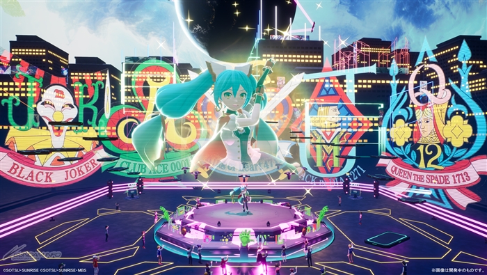 ライブ会場。ミクを中心とした全周ステージで、参加者はアバターのエモート機能を使った応援が可能。ステージや背景は曲ごとに切り替わる。