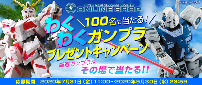 ガンダムベースオンラインショップでは、厳選ガンプラがその場で当たる「100名に当たる!わくわくガンプラプレゼントキャンペーン」が開催中だ。