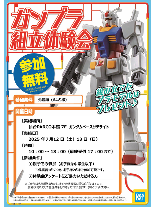 「ガンプラ組立体験会」が、7月12日(土)・13日(日)に宮城・THE GUNDAM BASE SATELLITE SENDAIにて開催される。参加無料。