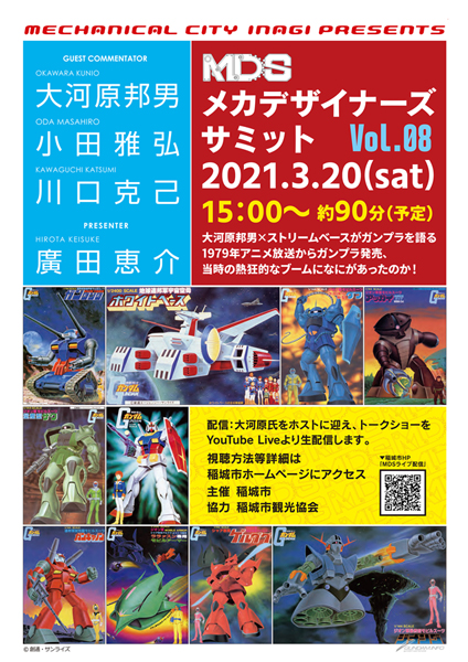 アニメーション業界におけるメカニカルデザイナーのパイオニア、大河原邦男さんをホストに迎えるトークイベント「MECHANICAL CITY INAGI PRESENTS メカデザイナーズサミット Vol.08」が、3月20日(土)にYouTube Liveで生配信される。