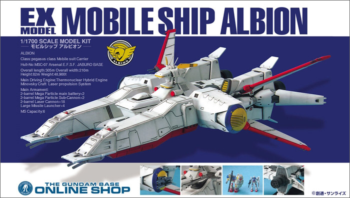 『機動戦士ガンダム0083』に登場した連邦軍の戦艦「アルビオン」が1/1700スケールモデルになって登場。パーツの差し替えにより、メガ粒子砲やカタパルトの展開、収納状態を再現できるほか、左右のカタパルトにはメタルパーツを採用 。同スケールの「ガンダムGP01」「ガンダムGP02A」に加えて、専用ディスプレイスタンドが付属する。