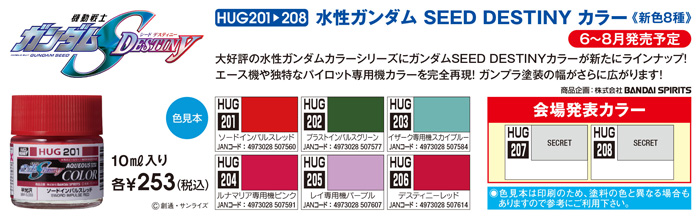 このほか、水性ガンダムカラーシリーズに、『機動戦士ガンダムSEED DESTINY』のキット用カラー「水性ガンダム SEED DESTINY カラー」が、6月から8月に発売されることも決定。5月14日(土)・15日(日)に開催される「第60回静岡ホビーショー」にて展示予定となっている。
