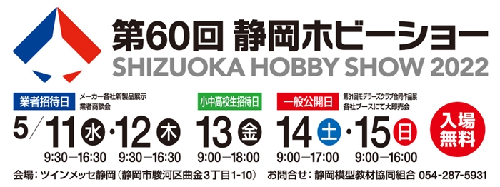 静岡・ツインメッセ静岡では、今週末5月14日(土)・15日(日)に、プラモデル・模型の一大見本市「第60回 静岡ホビーショー」が開催される。参加は事前予約制、入場無料。