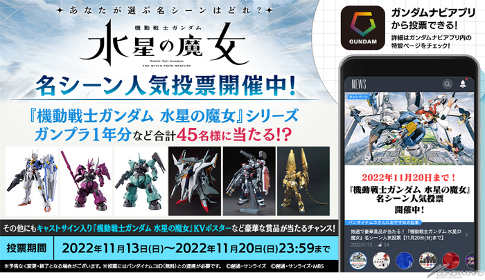 「『水星の魔女』名シーン人気投票」は、11月20日(日)23:59までにガンダムナビアプリ内で『水星の魔女』の名シーンを選んで投票すると、抽選でガンプラ1年分や『水星の魔女』キャストサイン入りポスターなどの豪華賞品が当たるキャンペーン。